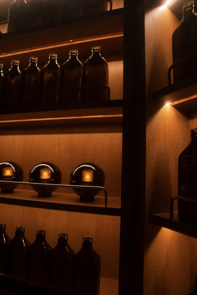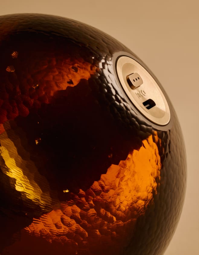 Bocci has reimagined its 14p light to embody the essence of both brands’ aesthetics. This limited-release, handcrafted object in Aesop’s signature amber takes the form of a portable, candle-like table light. Rechargeable and entirely wireless, the lamp is composed of two uniquely imperfect poured-glass hemispheres; much like each Aesop store, no two lights are the same.