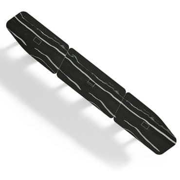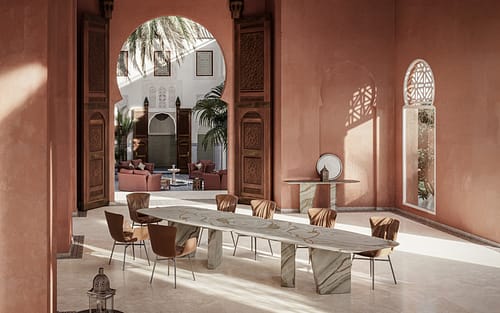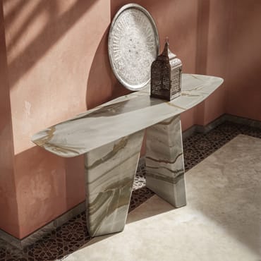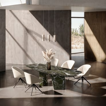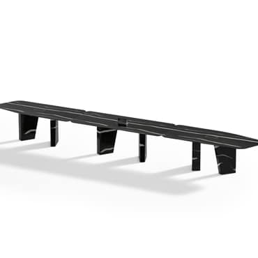 The matching console is also a must for such a system. Formally based on the table, the console nevertheless manages to stand alone. It combines the same attributes as the table – the harmonious design of the top with the monolithic base. It also provides additional storage space at the dining table and is a practical helper for serving food and drinks.