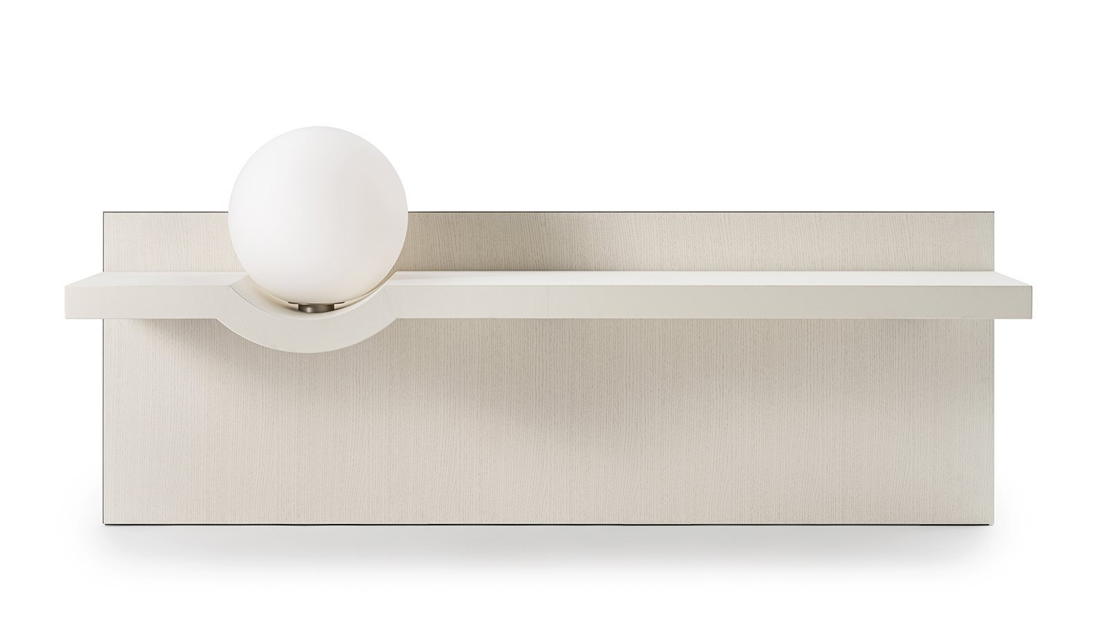 Shelf with boiserie in black stained open pore, tobacco stained open pore or “Pure” white stained open pore wood. Panel to be fixed to the wall. Wooden shelf covered by fard leather as per samples. Available positioned in the upper or lower part of the panel, to be specified when ordering. Opaque opaline glass lamp diam. 35 positioned on the shelf. (bulb E27 supplied). Available right or left version to be specified when ordering. Light activated by a touch sensor positioned under the shelf. Satin nickel metal profiles and sphere support. Also available version without lamp with shelf positioned in the upper or lower part of the panel, to be specified when ordering. Available in the combinations listed. NEW Panel without shelf in black stained open pore, tobacco stained open pore or “Pure” white stained open pore wood. Panel to be fixed to the wall.