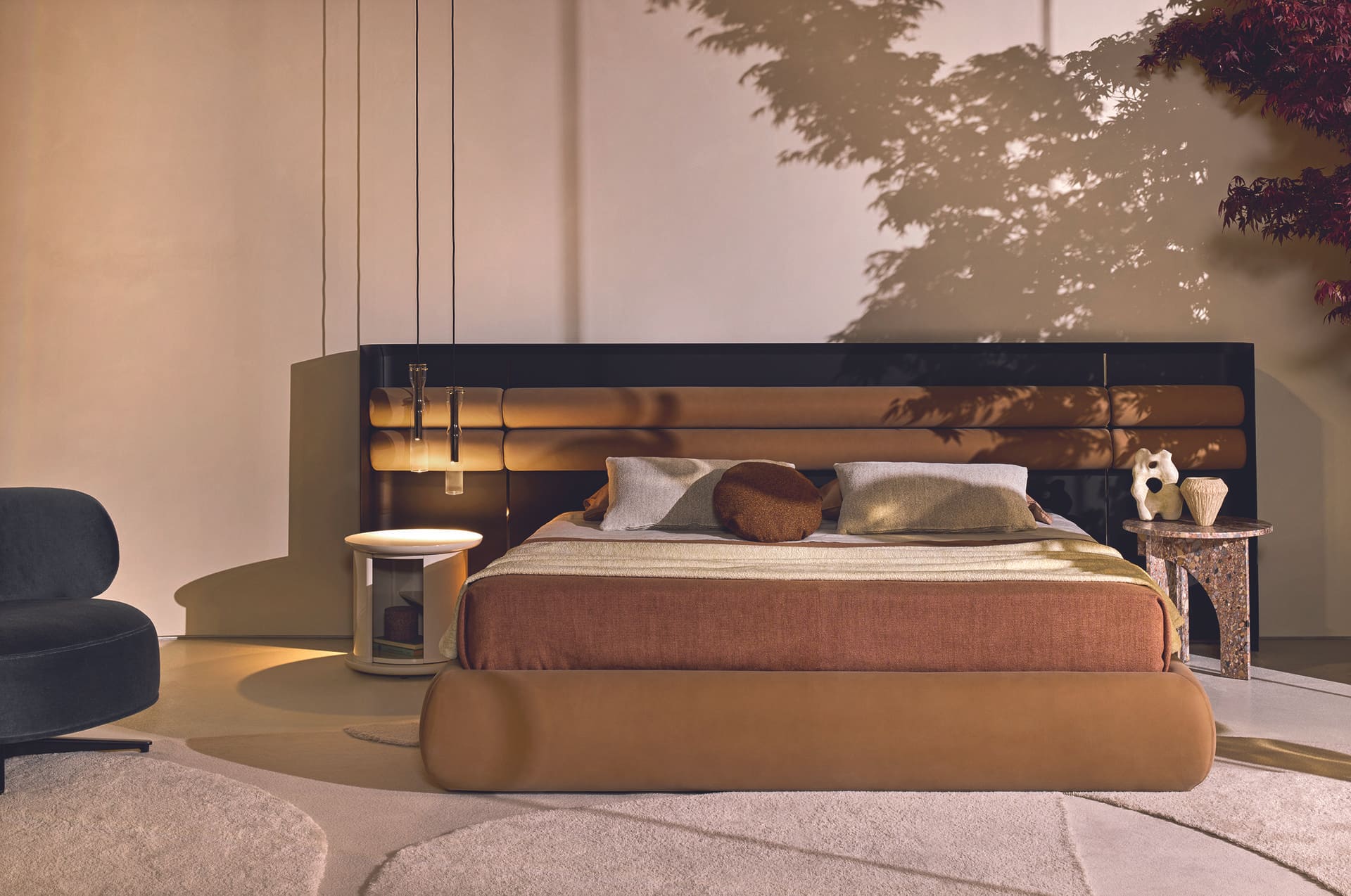 To complete the sleeping area, the Ato rug, hand tufted with New Zealand wool, features an abstract geometric pattern created through variations in weave and pile height. Available in three natural dye colours – “sand”, “dune” and “dust” – this rug adds warmth and character to the room.