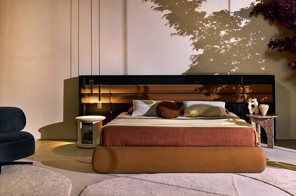 To complete the sleeping area, the Ato rug, hand tufted with New Zealand wool, features an abstract geometric pattern created through variations in weave and pile height. Available in three natural dye colours – “sand”, “dune” and “dust” – this rug adds warmth and character to the room.