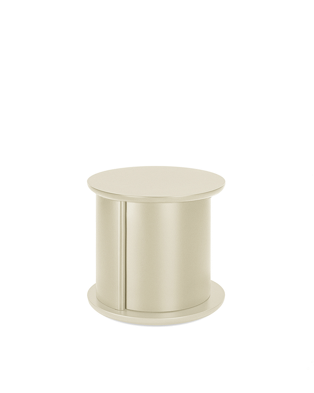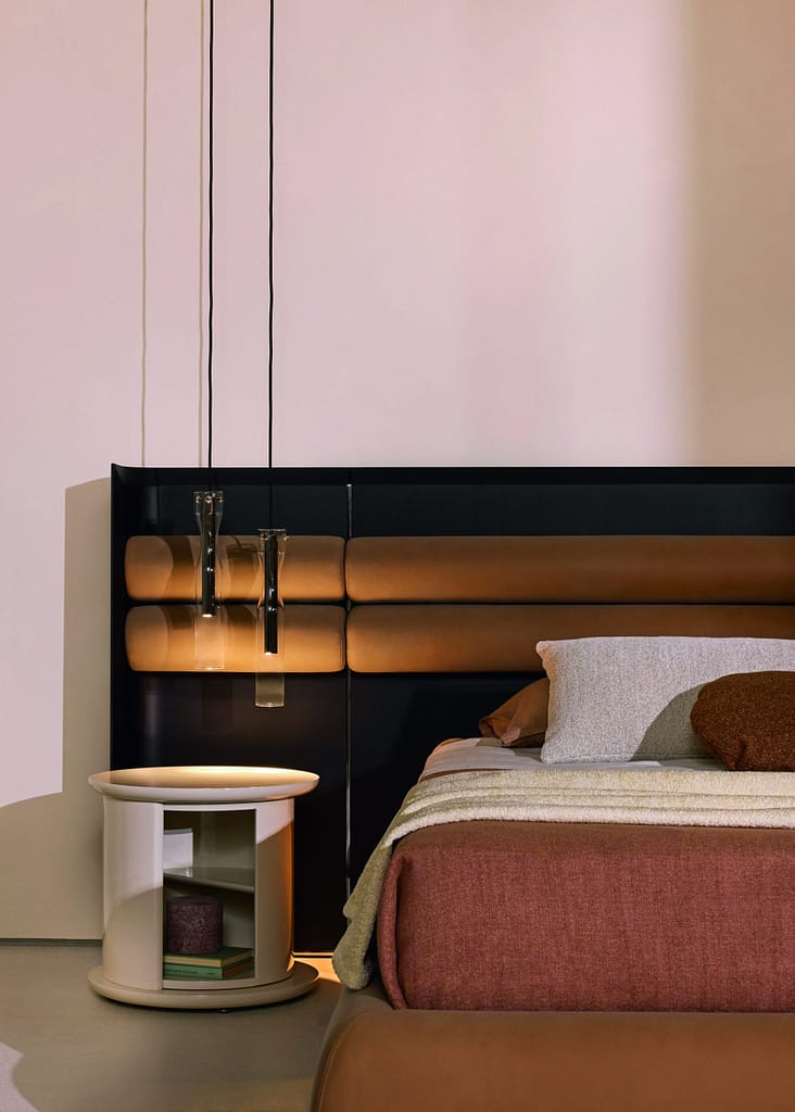 To enrich the sleeping area, the Hide&Seek Mini and Selce coffee tables are declined into unusual bedside tables, characterised by a unique design and a continuous search for new finishes and materials. Although these products contrast with each other, they establish a harmonious dialogue, contributing to a sophisticated and minimalist atmosphere, rich in personality and visual impact. Inspired by the 1970s, Hide&Seek Mini, designed by Pietro Russo, features a swivel cylinder and a glossy or matt lacquered wooden shelf, making it versatile for different settings, from living areas to more intimate spaces thanks to a range of intense and refined colours. Selce, designed by Studiopepe, expresses its personality through an interplay of contrasting materials (Volpi, Ceppo Antico and natural brushed Travertino Romano), volumes and heights, allowing the creation of geometric and dynamic compositions. The stone blocks overlap, creating unusual geometries and giving the tables a strong aesthetic and visual impact.