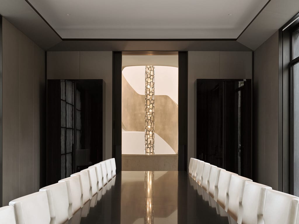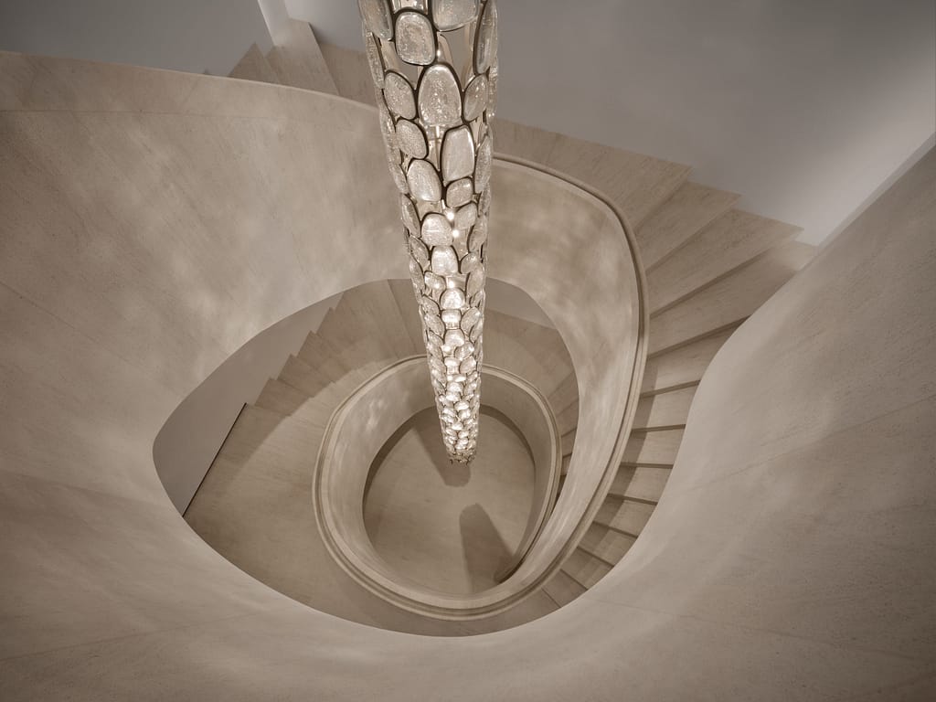 Engineered to suspend 30 feet from the ceiling without any visible fasteners, the Column boasts 750 artisanal glass cabochon pieces casting an ethereal reflection against the home’s three-story, sinuously curved limestone staircase.