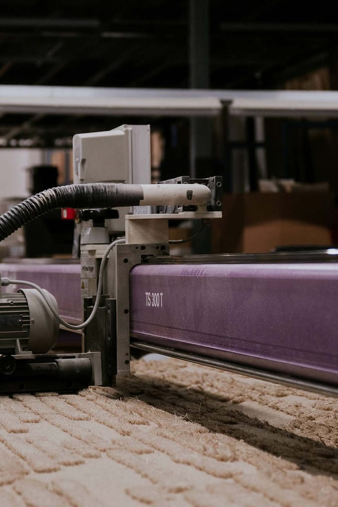 7. The rug is placed on an airplate where the edges of the backing are cut and the borders are folded.
