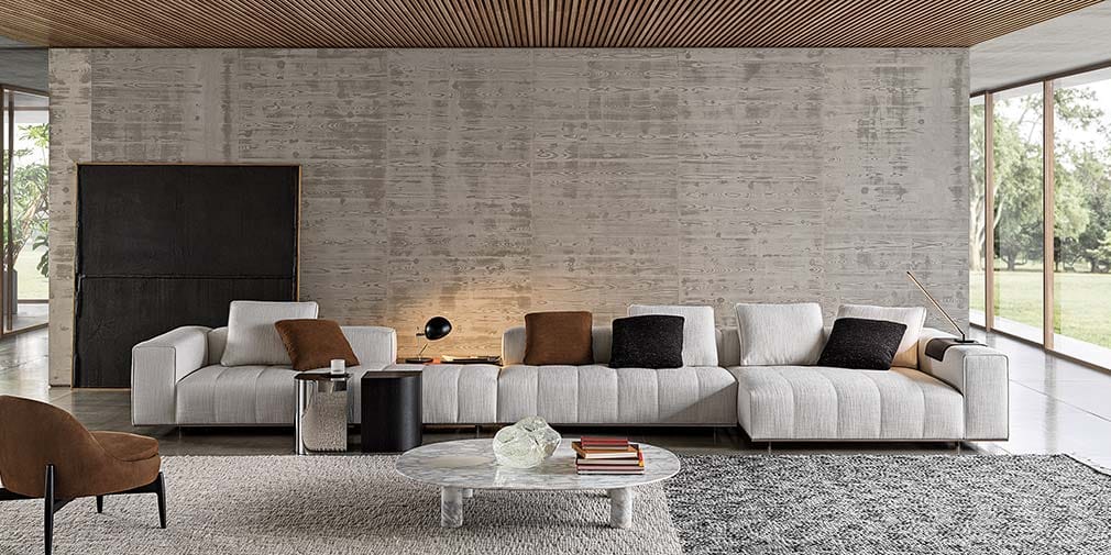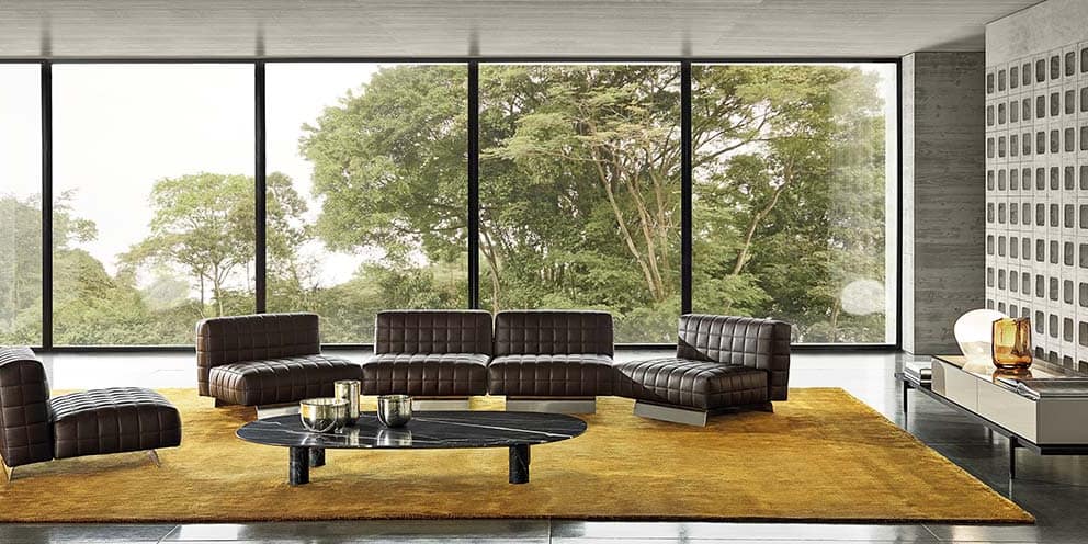 A sophisticated, precious look for the new seating system by Marcio Kogan / studio mk27: a floating island with squared lines, where the upholstered pieces – seats, backs, armrests – offer unprecedented comfort guaranteed by innovative technology that deploys pocket springs inserted in variable-density polyurethane, to keep the form constant. The base in leather or fabric, or a mixture of the two, houses tabletops in various finishes, such as dark brown stained canaletto walnut, liquorice-lacquered ash wood, Calacatta, Grigio Orobico or Nero Marquina matte polished marble, and brushed Belvedere granite.