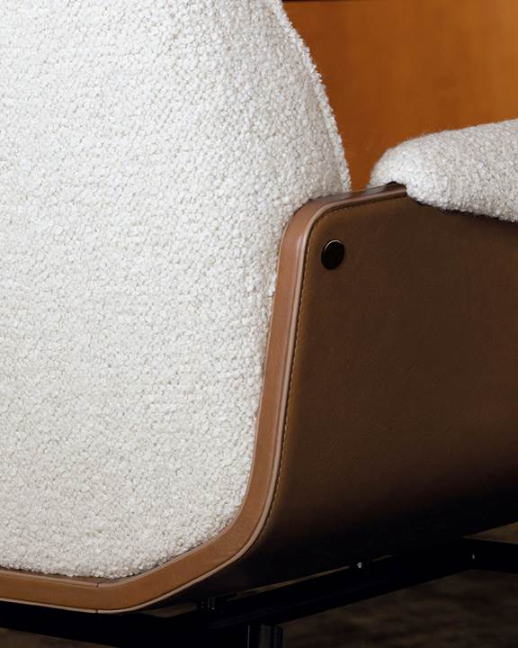 The shell of the seats – available in wood or upholstered in leather – accommodates the seat and back cushions, tailored with stitching, and rises upward to support the soft cushioning of the armrests.