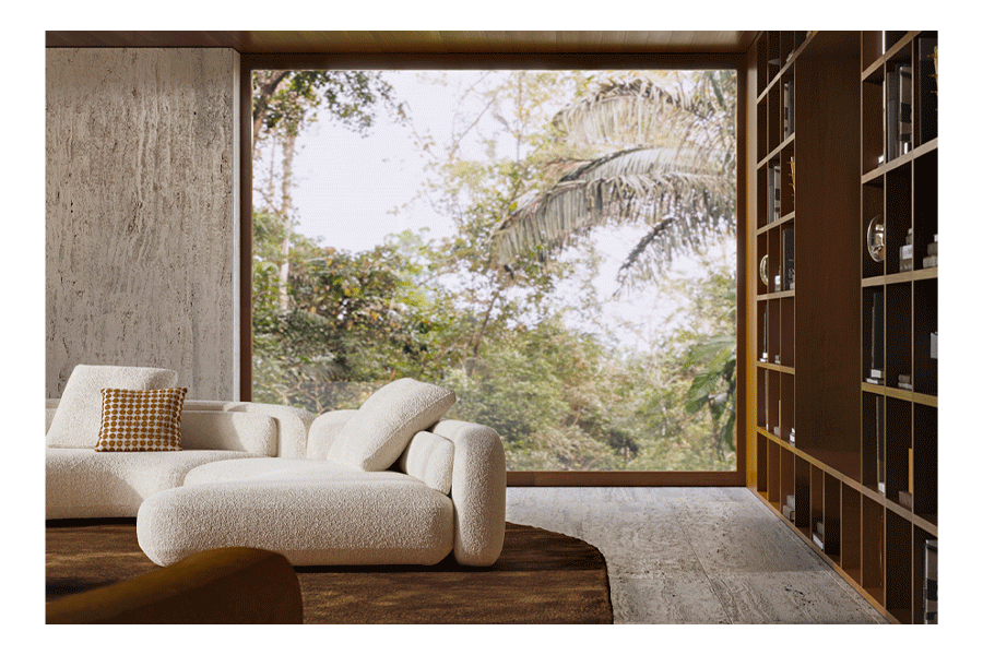 Setting the stage for the Bézier seating system — with its organic shapes and unparalleled comfort — is an eclectic environment inspired by Brazilian Modernism, where the light creates a refined balance between warmth and minimalism, intimacy and hospitality.