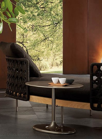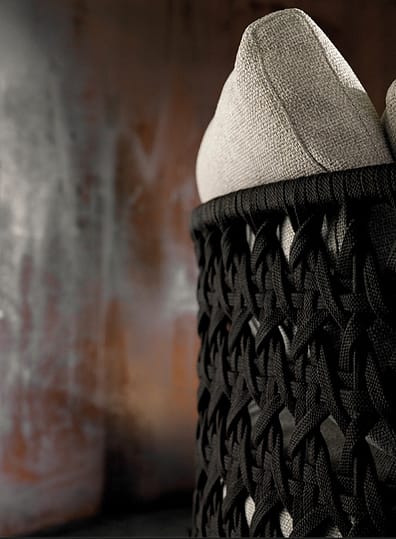 The ethereal appearance of these furnishing pieces dialogues harmoniously with their extreme materiality: the backrest, an enveloping nest, embraces and encloses the soft cushions resting on a solid natural teak frame. A succession of materials with a strong tactile impact and a welcoming feel, as if these sofas were primarily places in which to let go and relax. A design that is at times romantic and at times contemporary, thanks to its compact proportions, it easily fits into the decor on metropolitan terraces and in hospitality settings, satisfying both the most classic and the most modern aesthetic tastes.