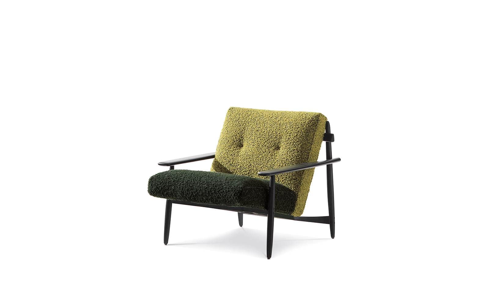 Weight-bearing, in solid ash with open-pore Licorice colour lacquer finish or in Canaletto walnut, stained Soft Brown with matt polyester lacquer finish. The wood is kiln-dried, crafted on CNC machines and assembled with dowel joinery. The wooden structure comprises a metal frame varnished polished Chestnut, Forest Green or Black Coffee colour. Metal shell coated in fire-resistant polyurethane foam with suspension provided by high-rubber-content elastic webbing, then covered with breathable heat-bonded fibre. Decorative stainless-steel screws varnished to match the finishes available for the metal frame are present on the legs of the armchair, near where they are joined to the frame. Tailoring of the cover features soft top-stitching.