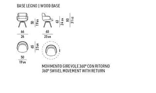 In solid ash with open-pore Licorice colour lacquer finish or in solid Canaletto walnut, stained Dark Brown with matt polyester lacquer finish. The legs are kiln-dried. Crafted on CNC machines and assembled with dowel joinery and glue. The wooden legs are attached to a metal frame varnished polished Black Coffee colour with anti-fingerprint finish; the swivel mechanism is attached to the upper part. 360° swivel movement with return. The base of the dining little armchair is also available in the fixed version. Black protective felt and/or polyethylene glides. BERGÈRE