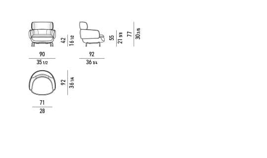 Cushions: seat cushion in high-resilience, variable-density polyurethane foam, then encased in breathable heat-bonded fibre laminated to white hypoallergenic cotton fabric. The backrest cushion of the large armchair has a core insert in variable-density polyurethane foam, and is then encased in breathable, heat-bonded fibre laminated to hypoallergenic white cotton fabric bearing the Minotti logo.