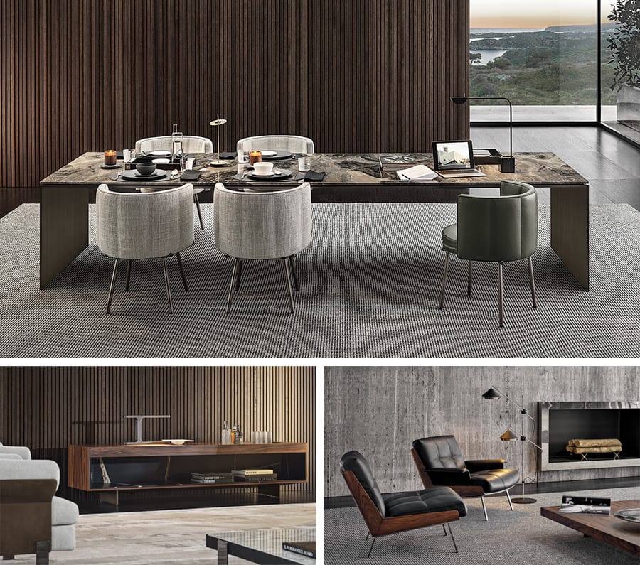 A collection designed for indoor and open-air living spaces, in a continuous dialogue with one another, located at different latitudes, in the residential and Hospitality sectors – in Europe, the Americas and Asia – by imagining those who live there, their gestures and daily routines. Pure, geometric volumes and shapes with an architectural appeal, distinguish the new upholstered seating systems, seats and furnishings, emphasised by their exquisite manufacturing quality, the precious selection of materials and exclusive textile collection.