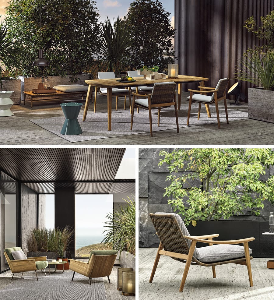 The collection is completed by the Fynn Outdoor seats and dining table by GamFratesi, the Daiki Outdoor seats by Marcio Kogan, the Terrace dining table by Rodolfo Dordoni and many other complements and accessories.