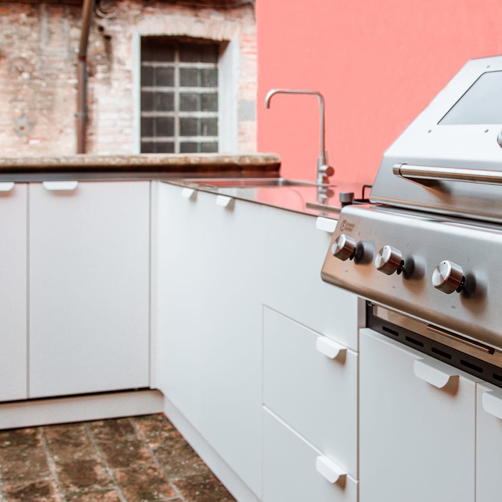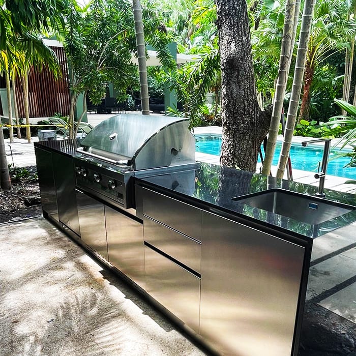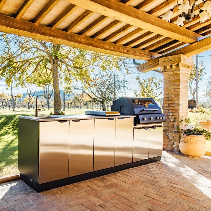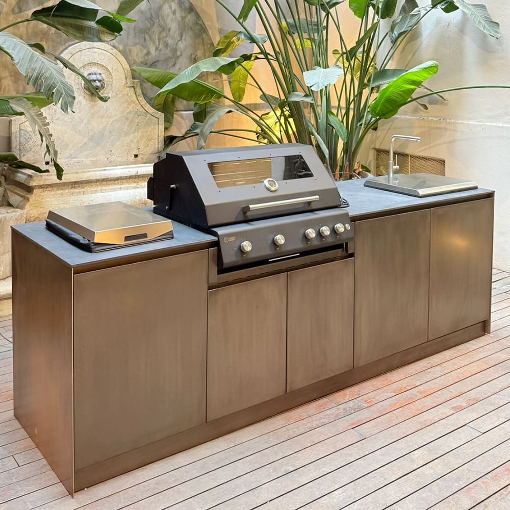 The kitchen structure is entirely made of stainless steel, a material that is resistant, elegant, and easy to maintain, ensuring exceptional longevity even in outdoor environments.