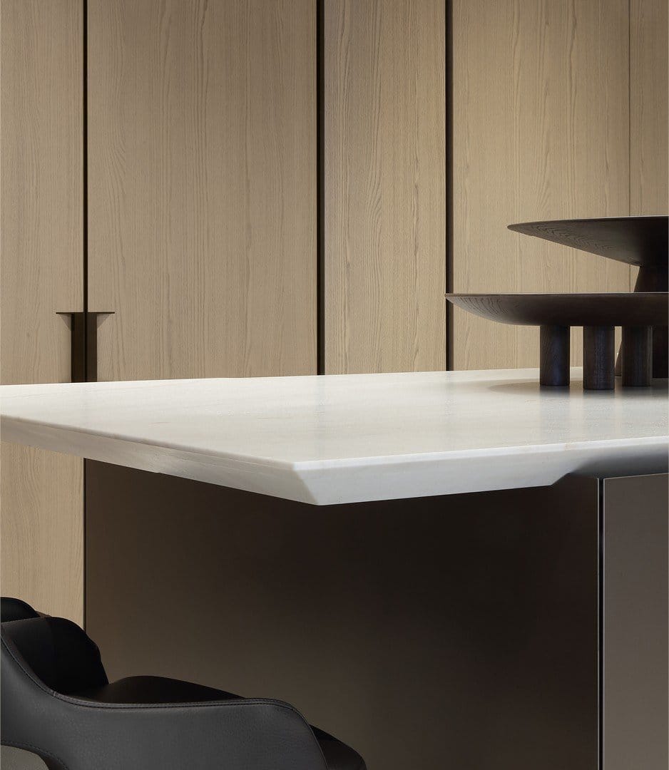 Poliform presents the restyling of Artex Pro, a natural yet even more contemporary evolution of the iconic kitchen system born from the original Artex. In this new interpretation, Artex Pro reimagines the defining features of the line with a more striking formal language and enhanced functionality. The lines are bolder—such as the pronounced and deep tapering—while the design embraces a broad versatility, thanks to a system that seamlessly integrates the working area with the dining space, in continuous dialogue with the Architectural System.