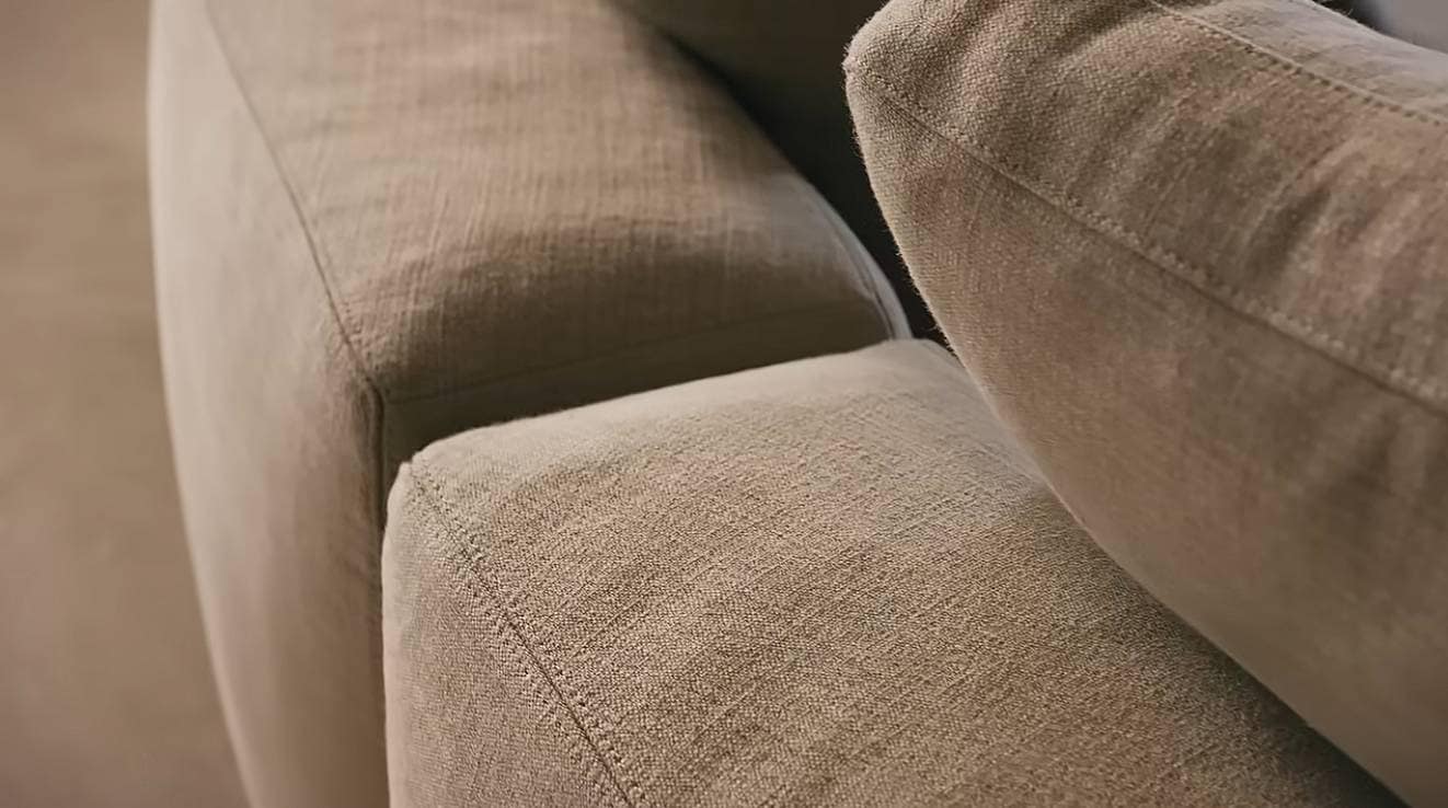 Brera sofa in removable Molai 01 sabbia fabric, cushions in Janaki 02 champagne fabric; base and Slim armrest in nero 02 leather, matte brown nickel feet.