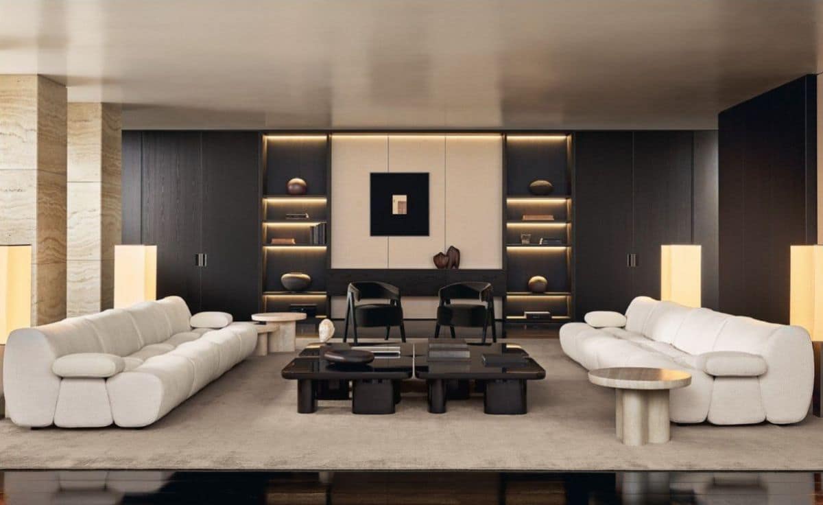 Glass showcases, portals and suspended sideboards add rhythm and texture, accentuated by the refined finishes of the back panels.