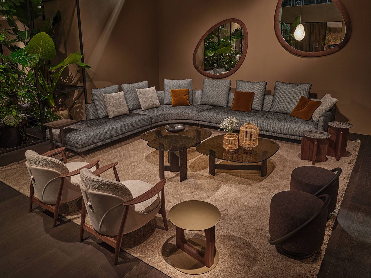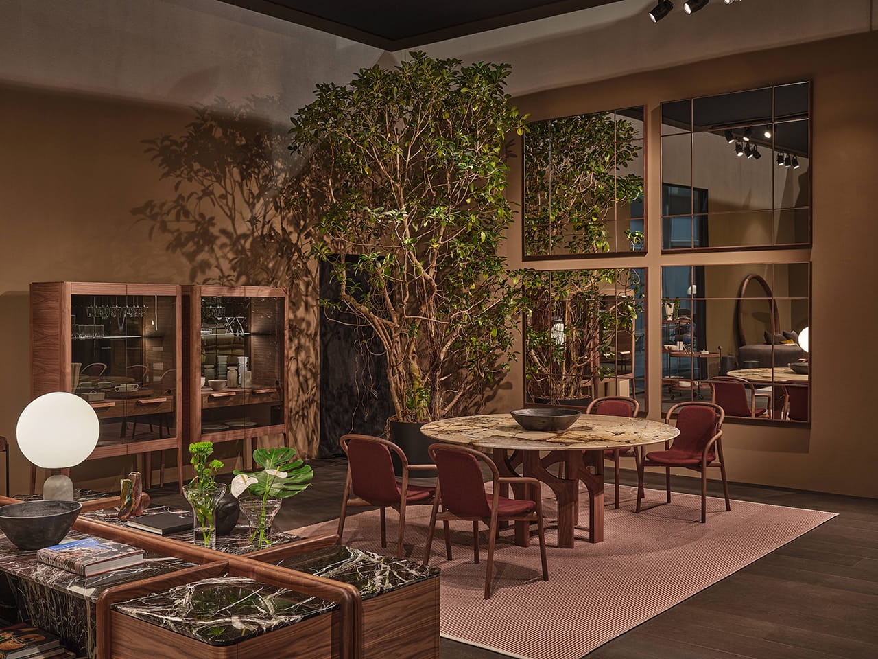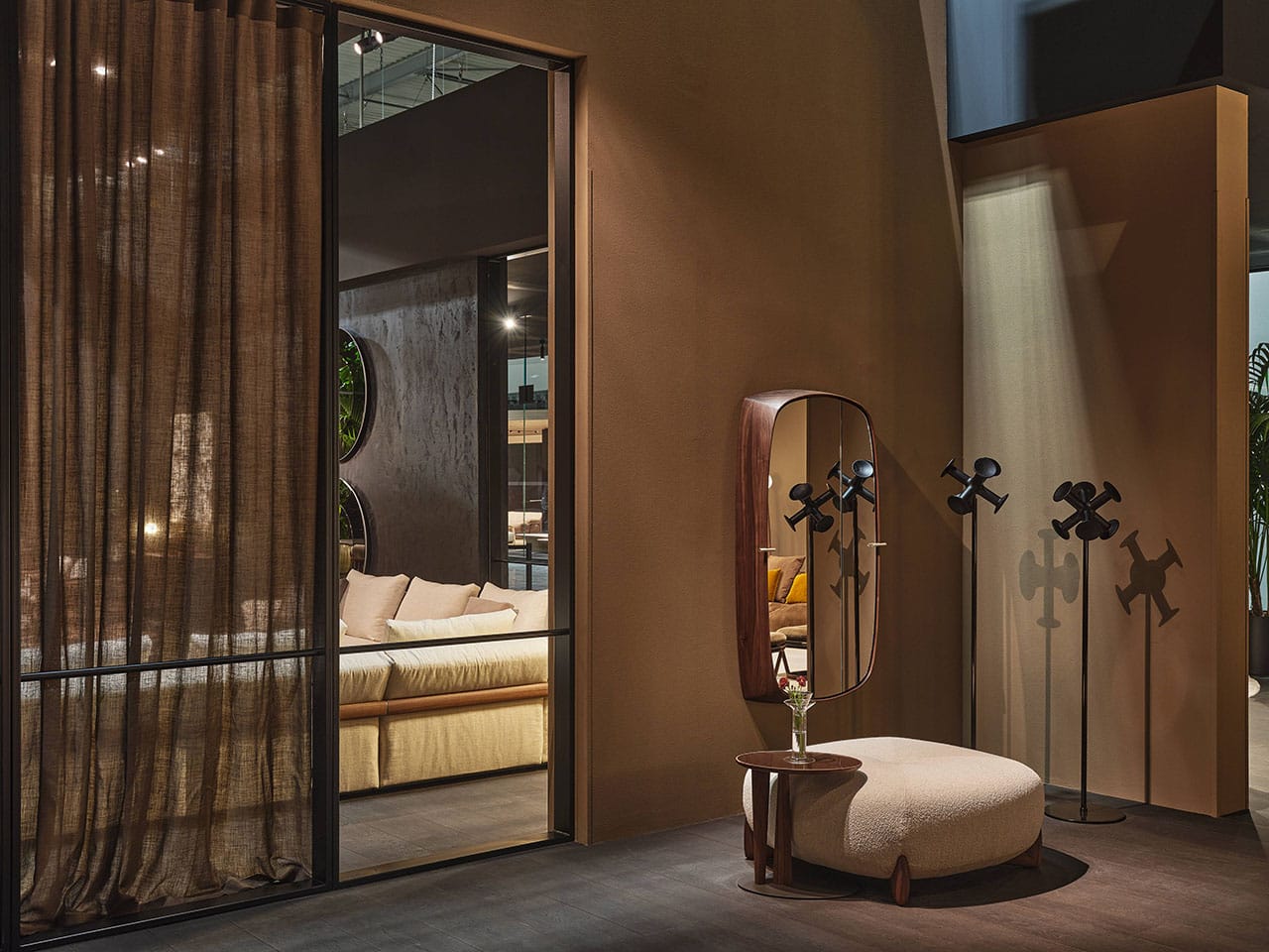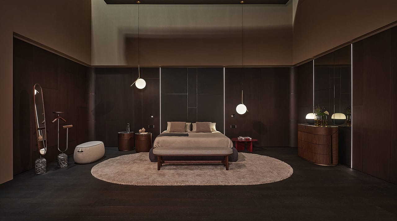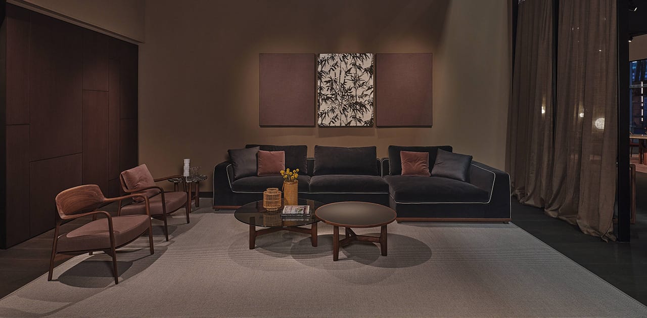Casa Porada, reimagined for 2025, takes centre stage at the 63rd edition of Salone del Mobile, the most important moment of the year for the design and interior sectors. This year, Porada presents the Twenty-Five collection, comprising over 20 products conceived and designed together with the brand’s long-term collaborators—both Italian and international designers. It’s a proven partnership that allows professionals to express their creative flair and Porada to bring out the aesthetic soul that so strongly distinguishes it. The design of the stand provides the visitor with a real Casa Porada experience, inspired by the beating heart of Milan, its history, and its timeless charm—a choice that celebrates the tradition of the Milanese home by linking contemporary design to the city's cultural heritage. The skilful use and positioning of openings, wings, and curtains arouse a sense of expectation and discovery that allows the visitor's attention to be focused on every detail. The warm shades of burgundy, brown, and ochre, in a harmonious fusion with the nuance of Canaletta walnut, make the environment enveloping and refined.