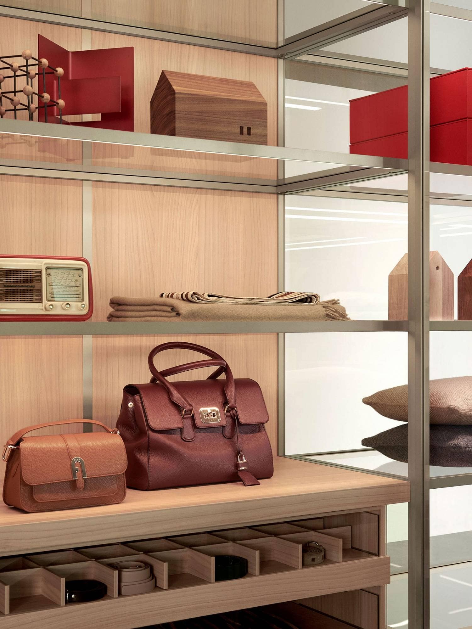 Inside the wardrobe the idea of space acquires a new value. Thanks to the three different types of structure – walk-in closet, traditional wardrobe and boiserie, now perfectly matching one another – it is possible to create open or closed spaces by alternating different materials for transparent and non-transparent solutions.