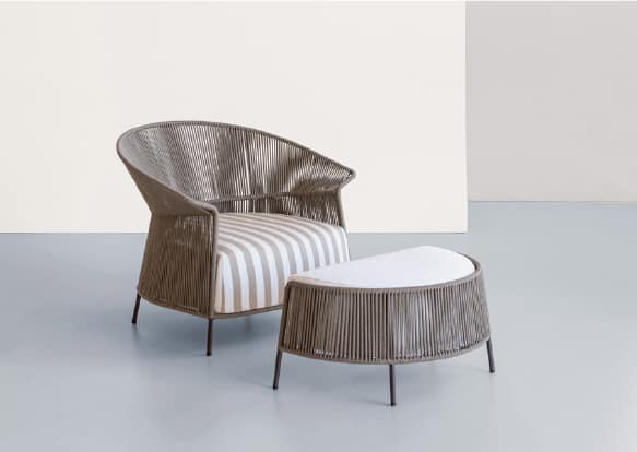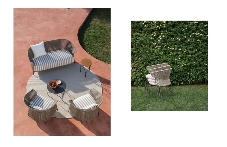 Defined in stackable chair, small armchair, tub chair, armchair, sofa and stool, the family is enriched this year by a new element: the pouf, which harmoniously continues the story of the collection, made up of weaves and refined details.
