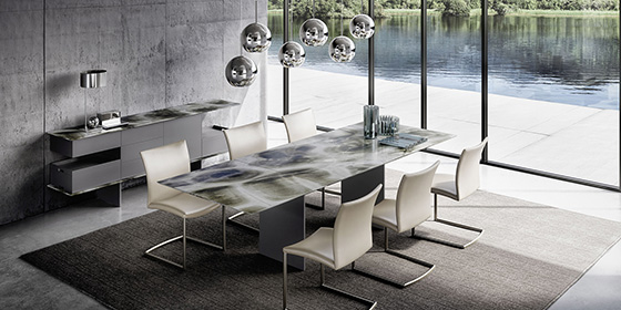 Its unique feature is a swivel plate integrated beneath the tabletop, which can be easily rotated using patented technology, ensuring that the table base remains centered regardless of the table’s size. When the extension plate is pulled out, the main plate smoothly moves along a sliding bearing guide. A spring support lifts the swivel plate at the front to align it with the main plate’s height. This table comes in a wide variety of natural stone options, as well as solid or veneered woods. The substructure, crafted from matte brushed aluminum, can have straight or curved side walls and can be color-coated upon request. In addition to the extendable version, a fixed-top Atlas dining table is available in various sizes.