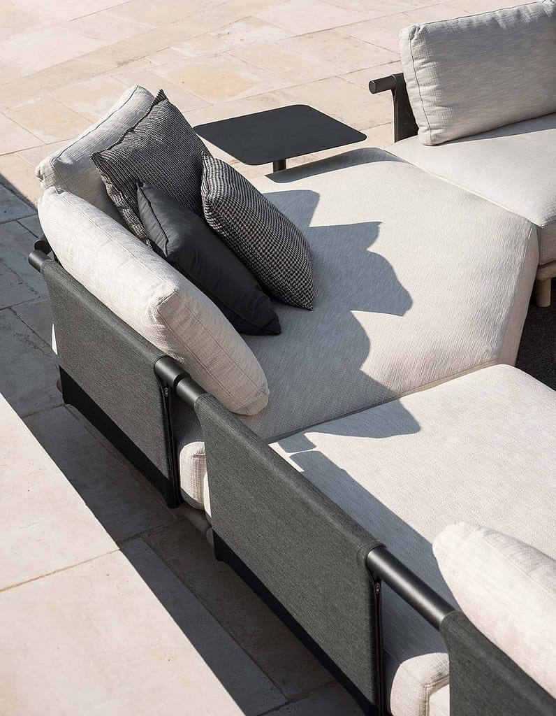 The base of the elements is made of teak, available in the natural finish or in the Weather Resistant white coloured one, a fresh and innovative alternative that enhances the naturalness of wood and increases its resistance to atmospheric agents.