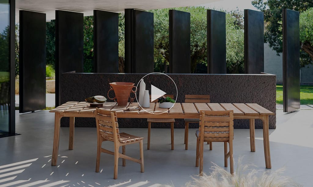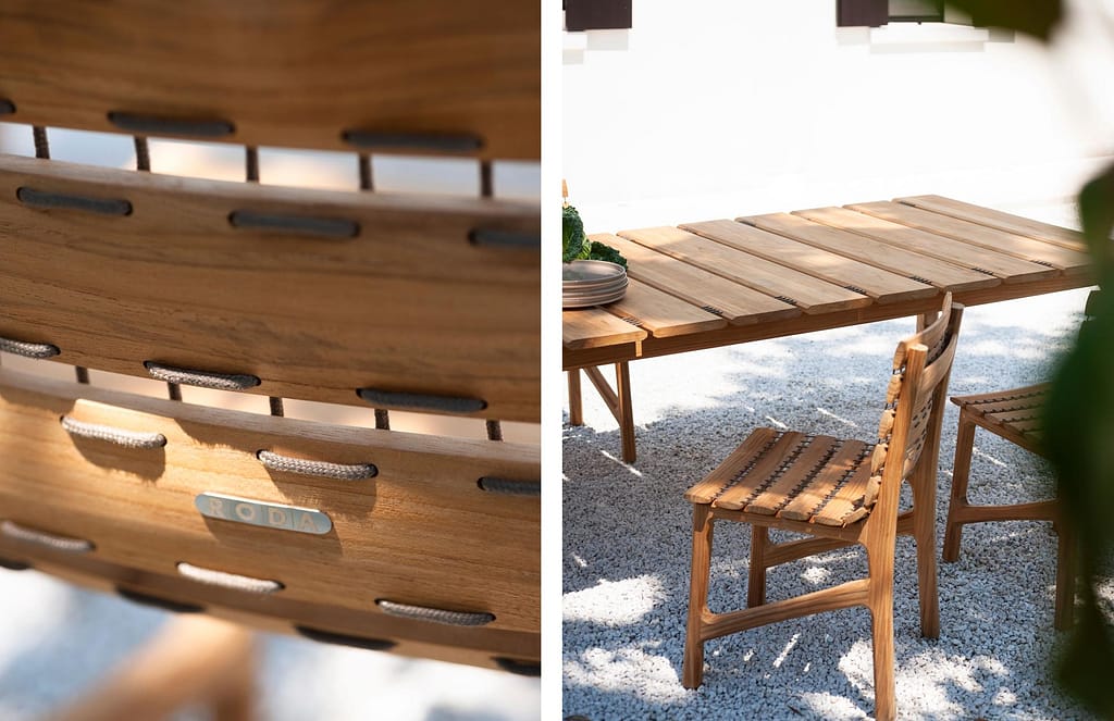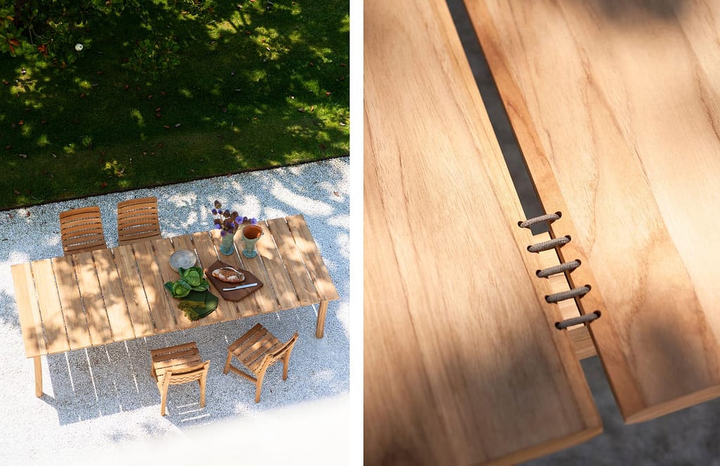 The characteristic feature of TESEO is the cord stitching joining the teak slats that make up both the tabletop and the chair.