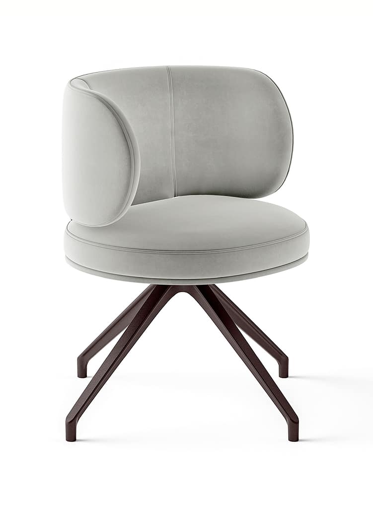 Akiko is characterized by a line reminiscent of traditional Oriental furniture. The Akiko chair has an upholstered seat and backrest covered in the fabrics and leathers in the sample book; the base is made of metal, and is offered in a warm grey finish.