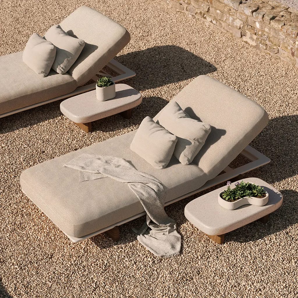 The sun lounger from the Milos collection harmoniously combines functionality and beauty. Precision manufactured, this sun lounger features a lacquered aluminium structure that ensures exceptional resistance to outdoor conditions. Its iroko wood legs add a touch of elegance and warmth, while providing stability and a connection to nature.