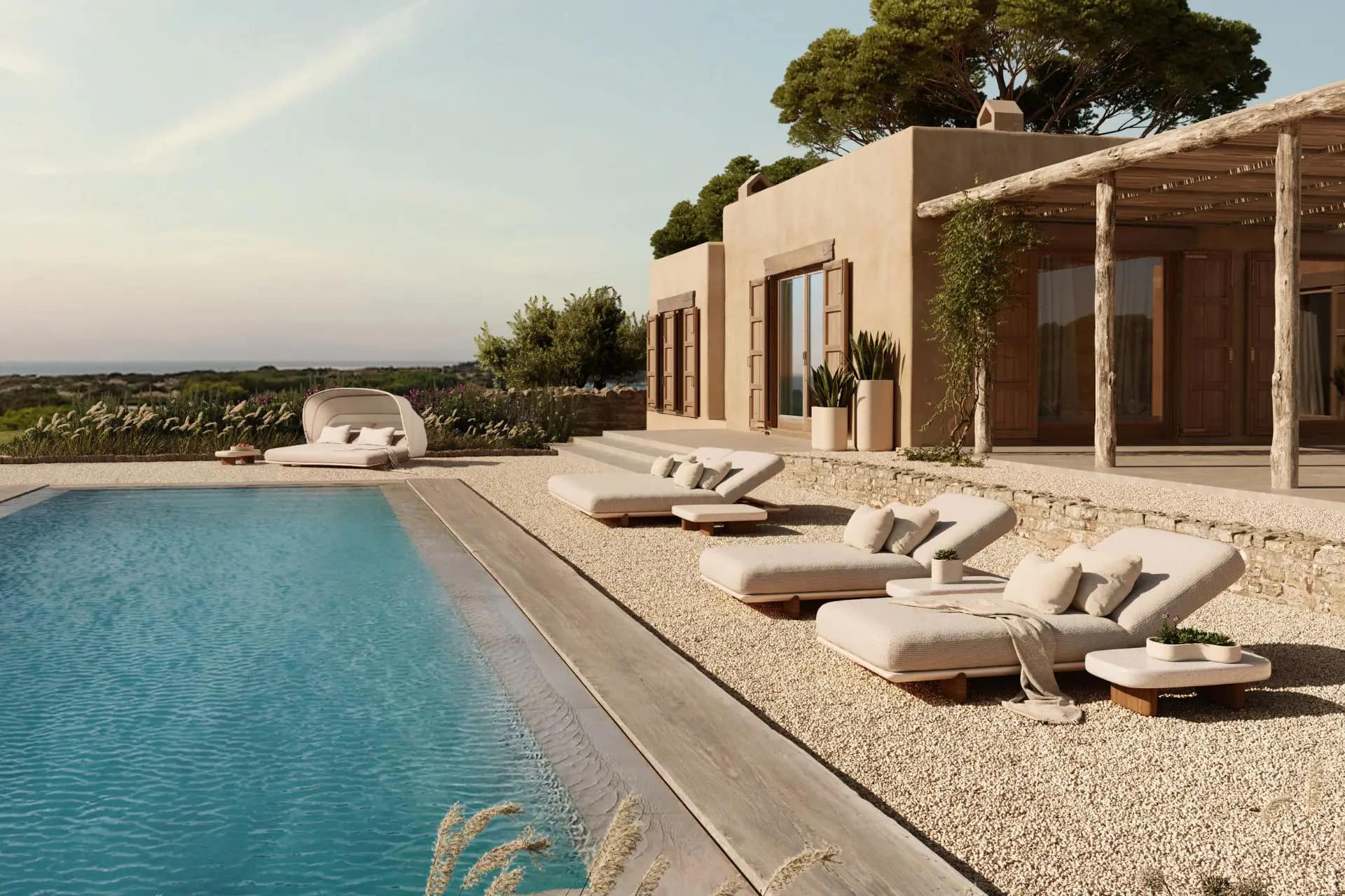 The Milos collection daybed combines functionality and beauty in perfect harmony. Precision crafted, it features a lacquered aluminium frame that ensures exceptional resistance to outdoor conditions, while its elegant iroko wood legs add a touch of warmth and sophistication, providing stability and a connection to nature.
