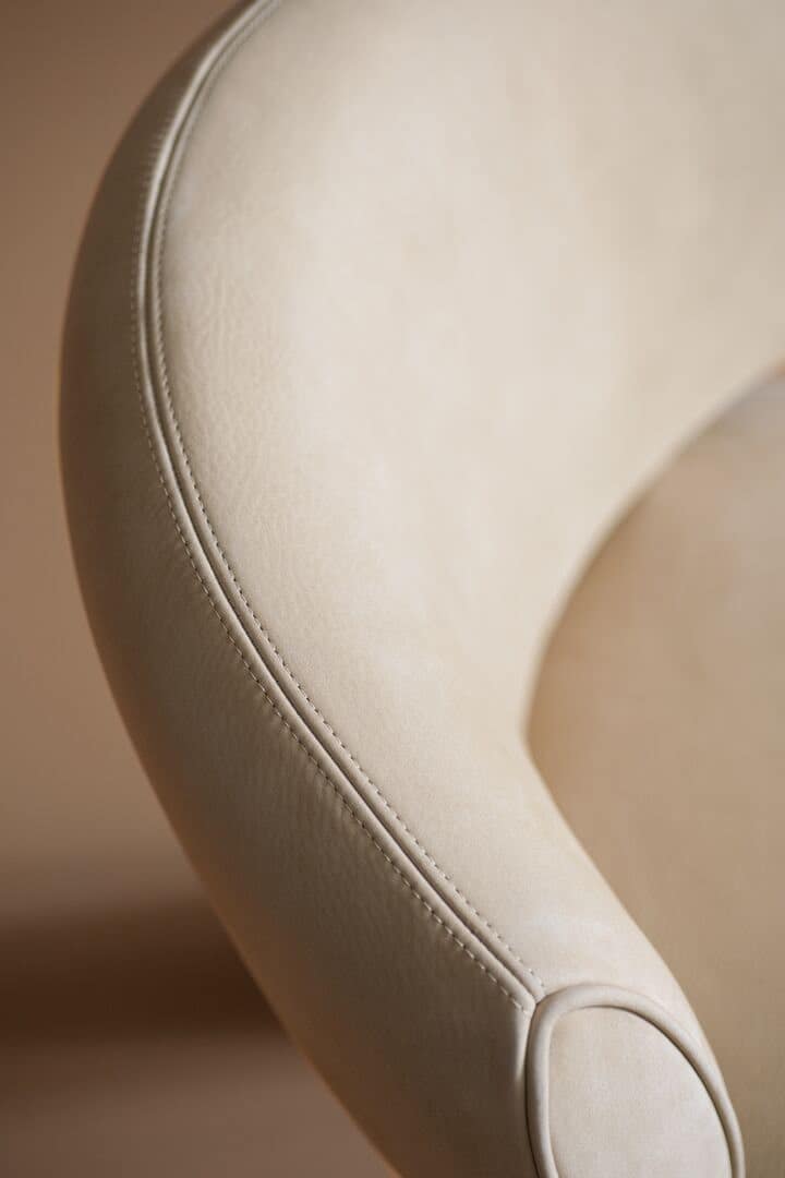 Inspired by 1970s aesthetics, the Libra armchair is composed of overlapping soft volumes of seat, backrest, and headrest, upholstered in leather or fabric. Each cushion is embellished with precise stitching at the centre that amplifies the tailored and three-dimensional effect. Metal frame seat structure with high-rubber-content elastic webbing, coated in fire-resistant polyurethane foam with additional Memory Foam covering. Available in bergère, armchair, ottoman, and dining little armchair configurations. Unique metal base construction with tubular legs and curvilinear plate supporting the seat. Refined piping along entire perimeter carefully shapes soft folds. Fully removable covers.